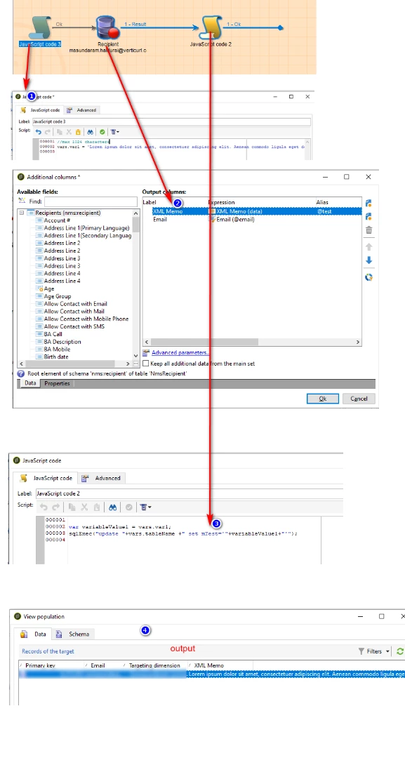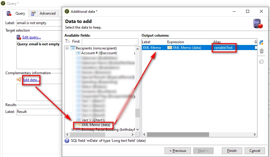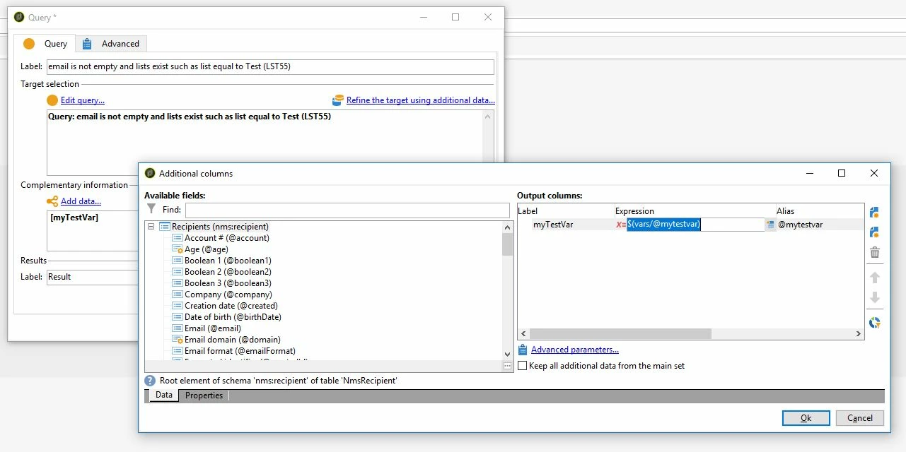 In the query activity, where I define the recipients, I add the variable above using 'complementary information' (also tried with enrichment activity, but end up with the same error).