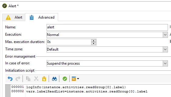 I have a ask where i need the variable code to get the label of the list activity in alert (such as <%= instance.label %> ), without passing any variable in the list activity.