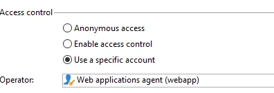 In the properties of the web application, in the access control, I select web applications agent. I have also tried the other two options, but the same error always appears.