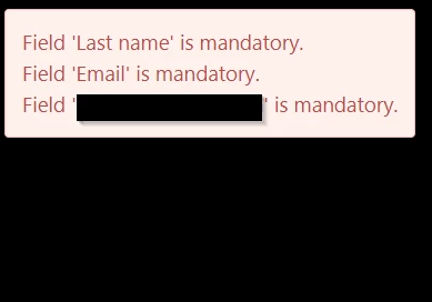 My finalquestion is if there is a way to change the default error messages that show up during form input validation. To be specific, it's what you can see in the screenshot, the nice red box that pops up with "Field X is mandatory".