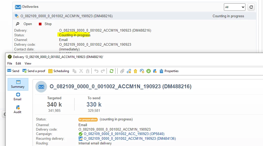 Counting in progress is similar to the personalization step. It counts the recipients but also ensures that the expected count is the same as the actual count. If the count is misaligned, an error will be thrown, and the delivery will fail.