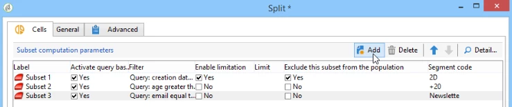 A Split-type activity lets you split a target into several subsets. You can split based on a filtering condition with targeting data or you can also limit the record counts.