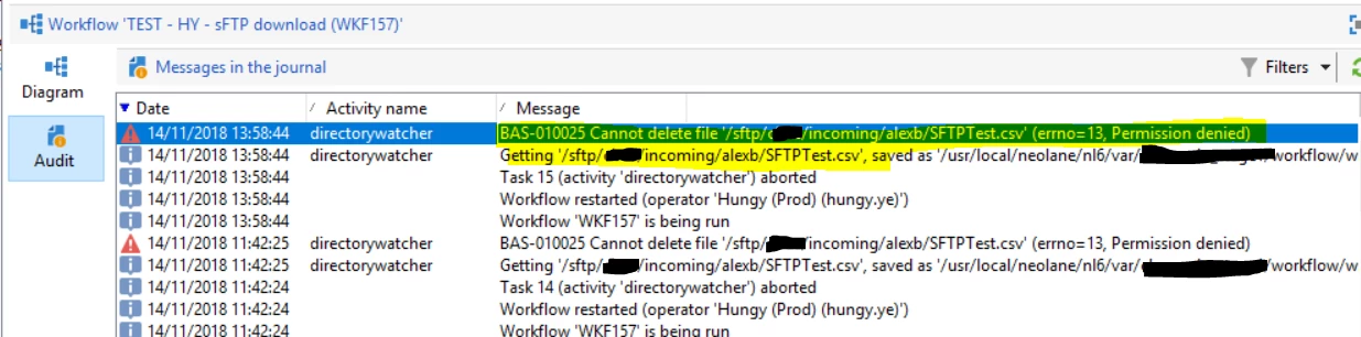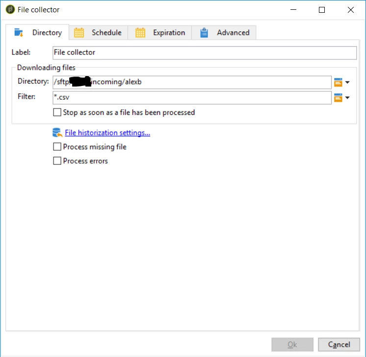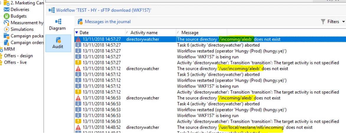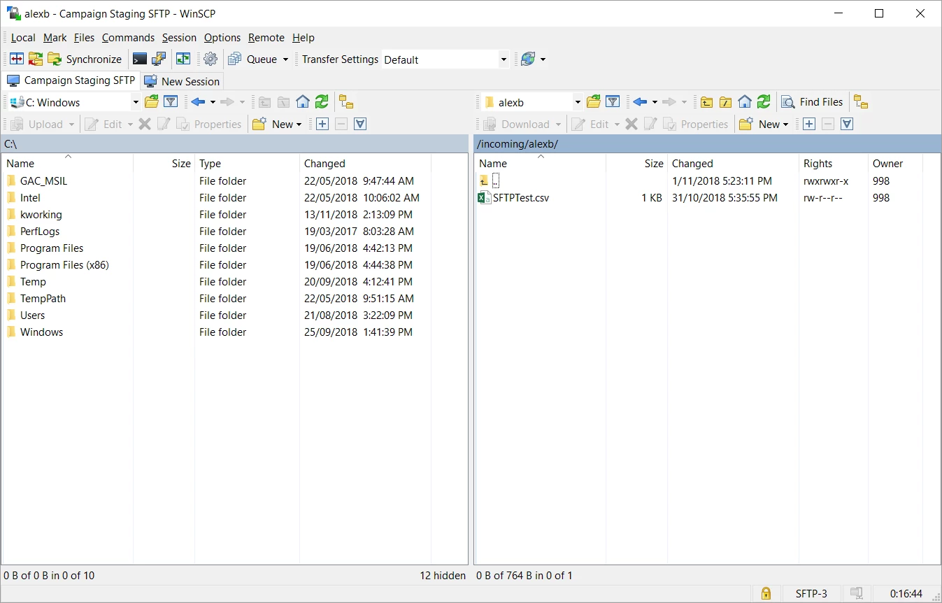 We have been provisioned sftp access to campaign and have loaded test files that we want to pick up with a file collection, as far as I can tell this is in the /incoming/alexb/ folder as per winscp below.