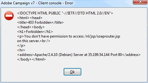 Working on a (first time) test install of campaign v7 on a Debian 8 server and after following the install instructions, I get the following when I try connecting the console program for initial configuration. "403 Forbidden: You don't have permission to access /nl/jsp/soaprouter.jsp"