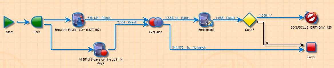 And I've created a birthday journey for all of them that will send an email to them if they met my criteria (in this case their birthday is in 14 days). Problem is it looks like this: