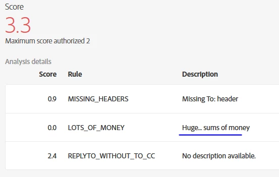 It's flagging that there's money mentioned in the body of the email, but it assigns a score of 0.0 to it. What's the point of this / is it worth adjusting the copy in the email?