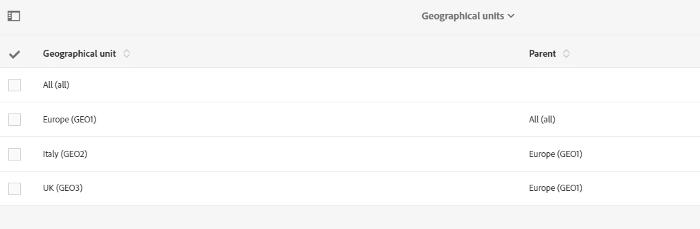 I want that the column Geographical Unit is valued with "IT" or "UK" (I have already create this geographical unit in the dedicated section)