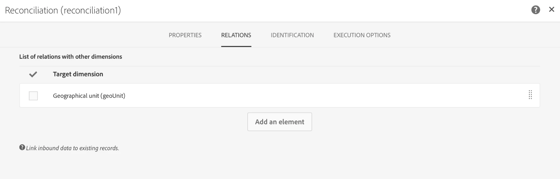 2. Then, I use a reconciliation activity. I use the "Relations" tab only to tell the system that the data I am importing from the file contains also information related to the geounit resource (using the country column of the file). In this specific example, values of the country column of my file ("France" and "Italy") correspond to the Label field of my geounit resource, so I create the link with @label.