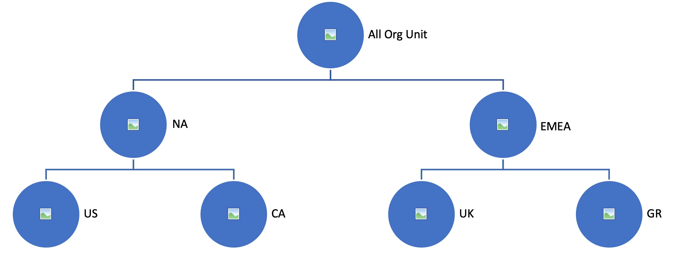 In case the attached Org Unit sample image doesn't display, let's say under All - exists child units NA and EMEA. Children units of NA are US and CA. Children units of EMEA are UK and GR.