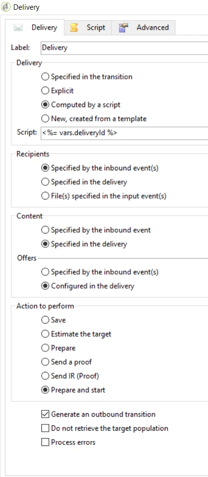// "Prepare and start" option selected in the Delivery tab of this activity