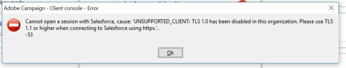 I am trying to integrate salesforce dev org with Adobe Campaign using CRM connector, Since salesforce upgraded TLS 1.0 to higher level TLS 1.1, i am getting an error as in the screenshot. Is there any alternate way to resolve this issue from Adobe campaign end or we need to rely on salesforce support?