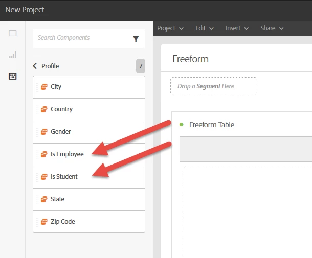 It is possible to create new Dimensions for use in Dynamic Reporting by adding Profile fields to a Sending Logs Extension; these added fields will then appear in the Dimensions area. Here is an example in which we extended the sending logs with our custom fields "Is Employee" and "Is Student"; these then became available as Dimensions.