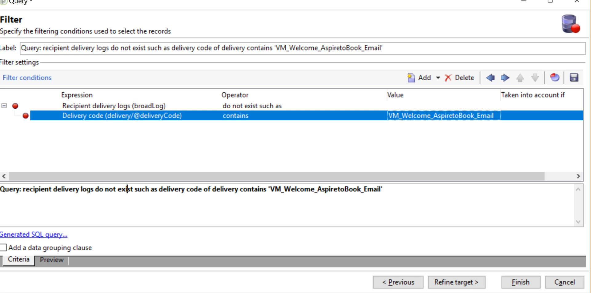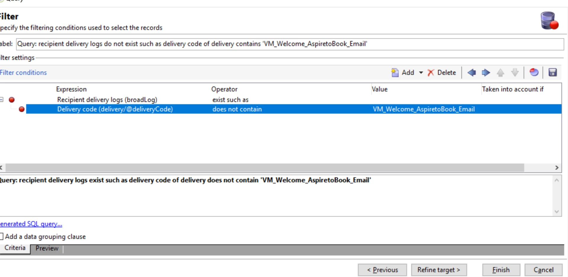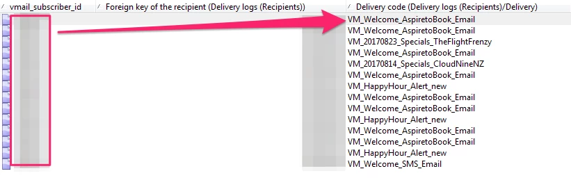 For confidentiality, I have blurred the id's but lets imagine those id's are the same. One id can consist of many delivery code in this targeting dimension, how do I make a filter such that if any of the delivery code is contains/equal to "VM_Welcome_AspiretoBook_Email" I want all this vmail_subscriber_id to be excluded/filtered out from the targeting dimension?
