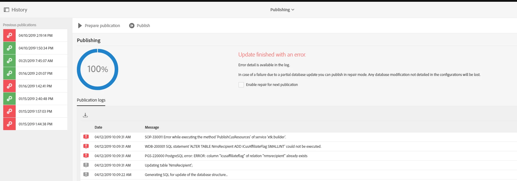 However - when I got to publish the schema I get this error message.