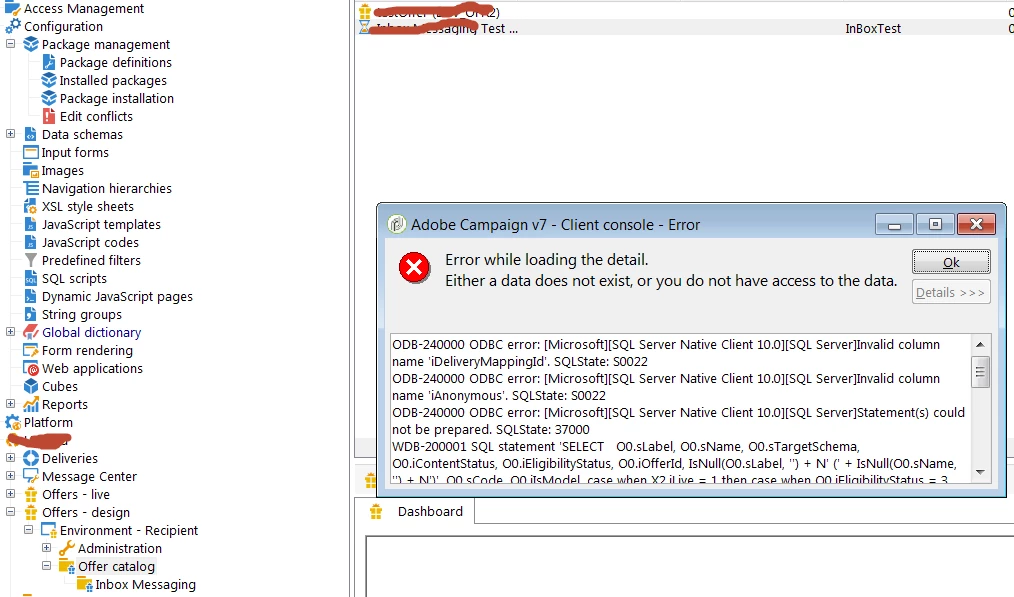 WDB-200001 SQL statement 'SELECT O0.sLabel, O0.sName, O0.sTargetSchema, O0.iContentStatus, O0.iEligibilityStatus, O0.iOfferId, IsNull(O0.sLabel, '') + N' (' + IsNull(O0.sName, '') + N')', O0.sCode, O0.iIsModel, case when X2.iLive = 1 then case when O0.iEligibilityStatus = 3 and O0.iContentStatus = 3 then 6 else 5 end else case when O0.iEligibilityStatus IN (1 , 2 , 4) or O0.iContentStatus IN (1 , 2 , 4) then 2 else case when O0.iEligibilityStatus = 3 and O0.iContentStatus = 3 then 7 else case when O0.iEligibilityStatus = 5 and O0.iContentStatus = 5 then 8 else 0 end end end end, O0.iOwnerId, O0.iCategoryId, O0.sDesc, O0.tsStart, O0.tsEnd, O0.tsExpectedEligibility, O0.tsReminderEligibility, O0.tsExpectedContent, O0.tsReminderContent, X1.iEnvId, X1.sLabel, X1.iFolderId, X1.sFullName, X2.sInputSchema, X2.iDeliveryMappingId, X2.iLive, X2.iAnonymous, X2.iFolderId, IsNull(O3.sLabel, '') + N' (' + IsNull(O3.sName, '') + N')', O3.iOperatorId, O3.iType, O0.mData, X2.mData FROM NmsOffer O0 JOIN XtkFolder X1 ON (X1.iFolderId = O0.iCategoryId) JOIN XtkFolder X2 ON (X2.iFolderId = X1.iEnvId) JOIN XtkOperator O3 ON (O3.iOperatorId = O0.iOwnerId) WHERE (O0.iOfferId = ?)' could not be executed.