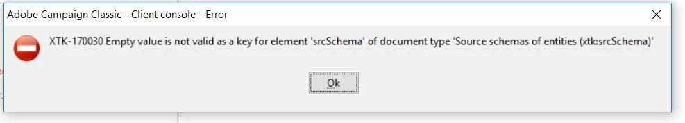 Error -xtk-170030 empty value is not valid as a key for element srcSchema of document type Source schema of entities (xtk:srcShema) while editing any schema