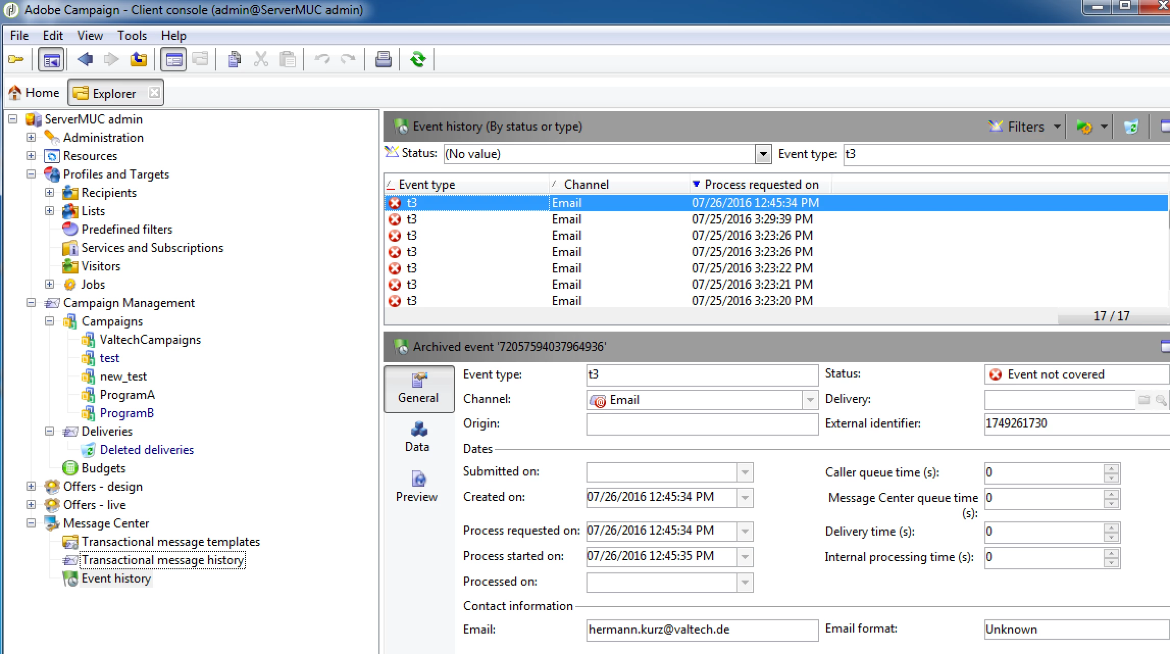 In the event history of the message center i see the event (see screenshot), but it is marked as "Event not covered" and no email is sent.