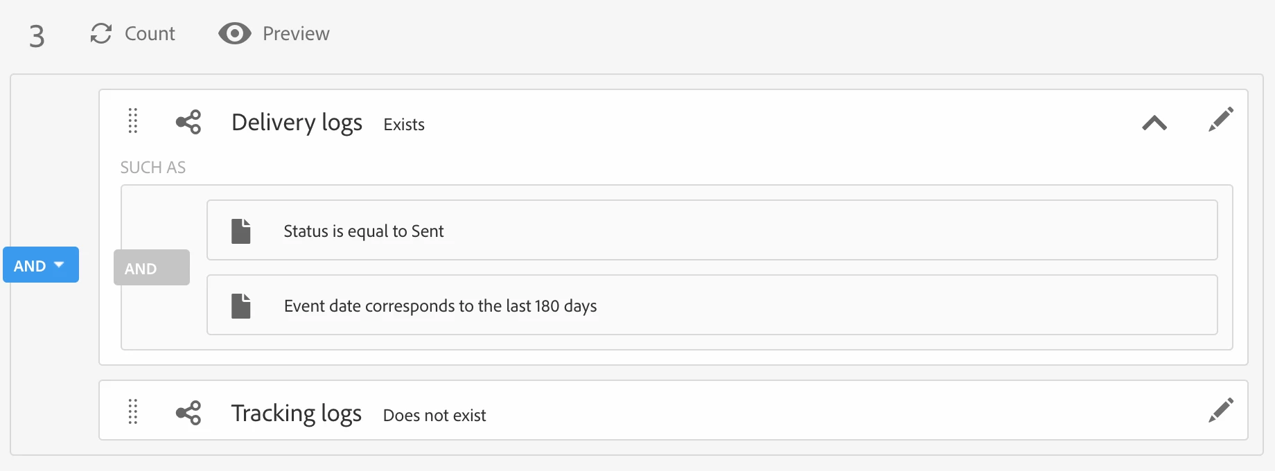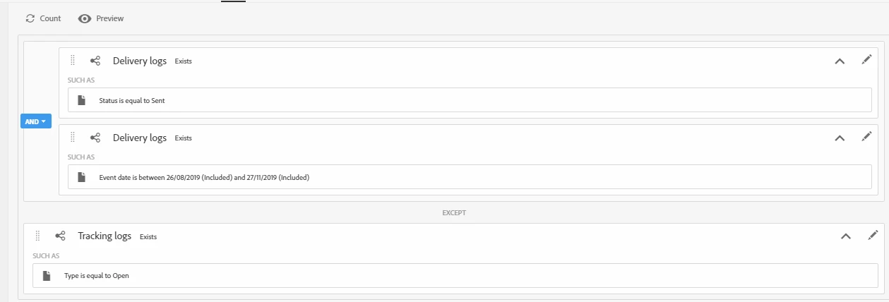 I want to send a delivery excluding everyone who has not opened an email in the last 180 days. When adding into a query the delivery, it only allows me to select deliveries one by one, I cannot select all, nor I can select a date range.