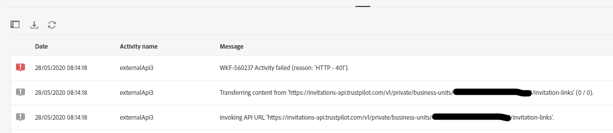 External API activity Error
