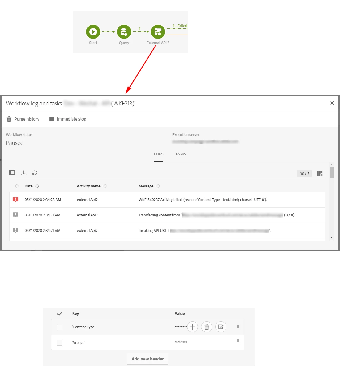 This is the first time I'm using External API activity in ACS. I tried to execute the workflow. I'm getting the following error. Please advise what went wrong.