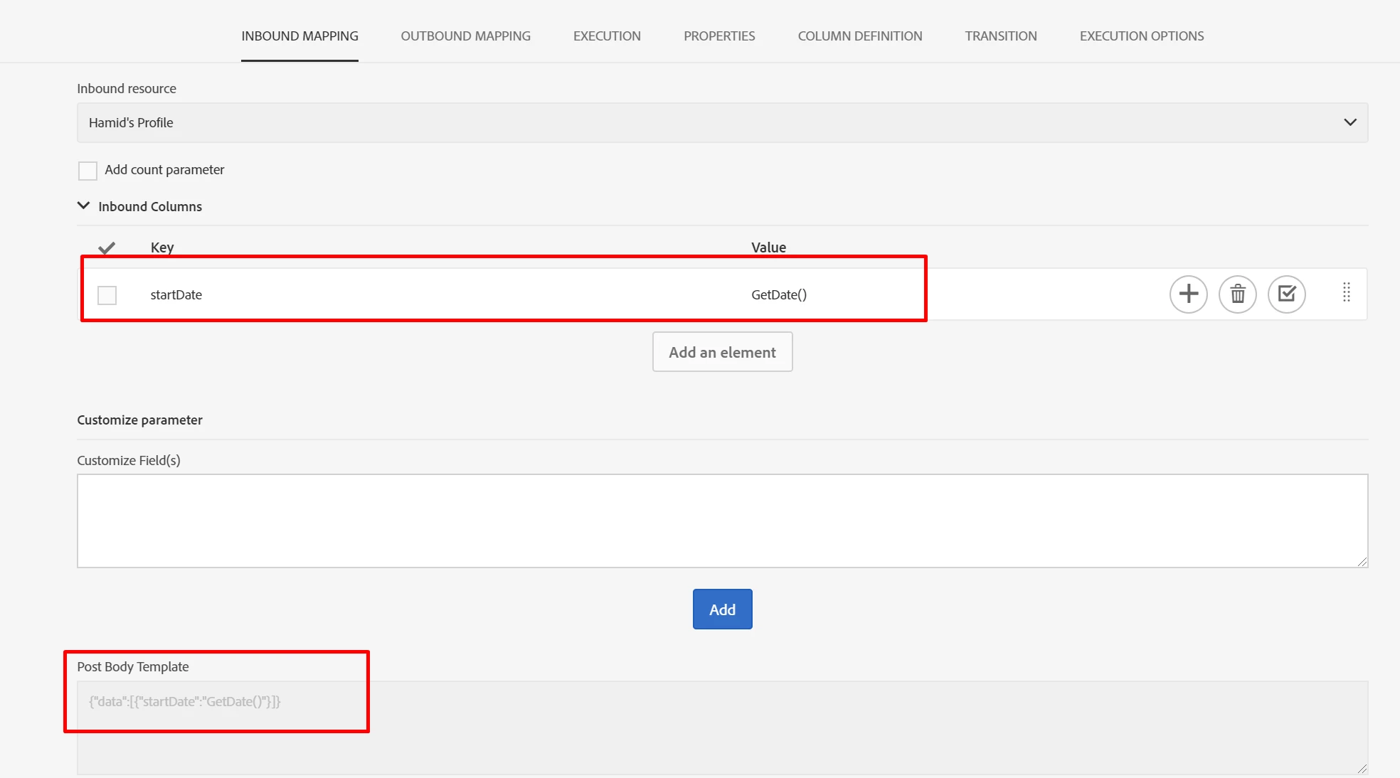 In the External API activity we can add inbound columns but id does not generate the correct query