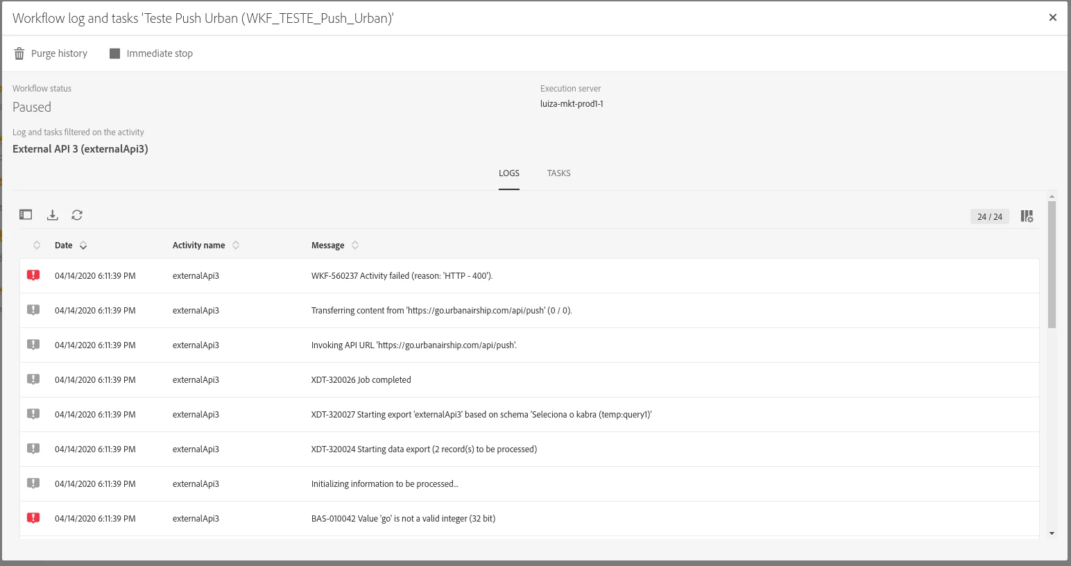 The log error: (400 - Bad Request)