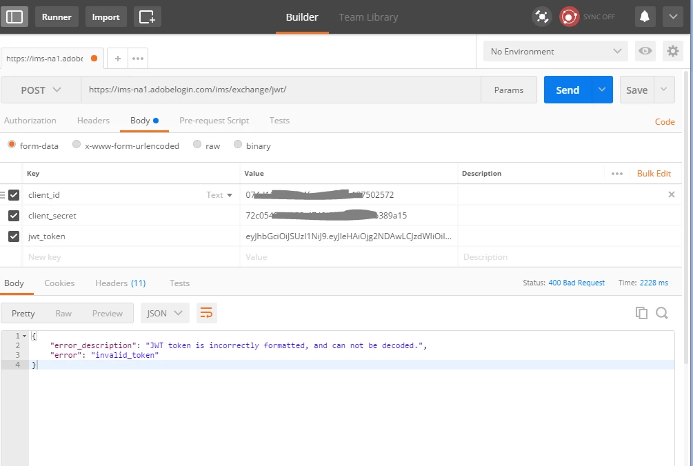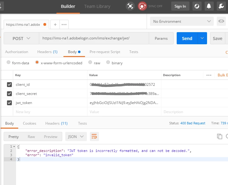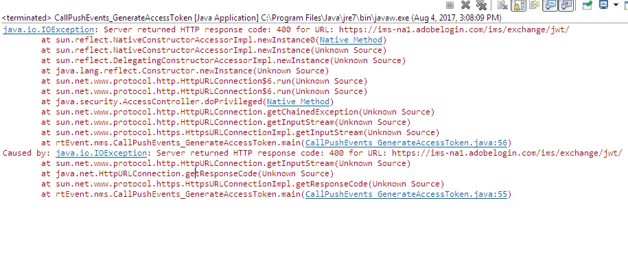 Server returned HTTP response code: 400 for URL: https://ims-na1.adobelogin.com/ims/exchange/jwt/