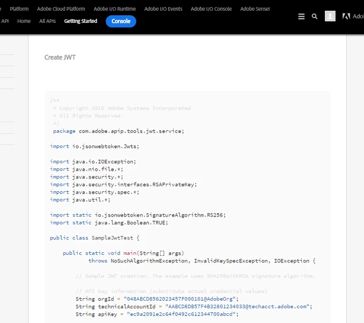 Then I came across the way to generate JWT token by using Adobe IO JWT tab.