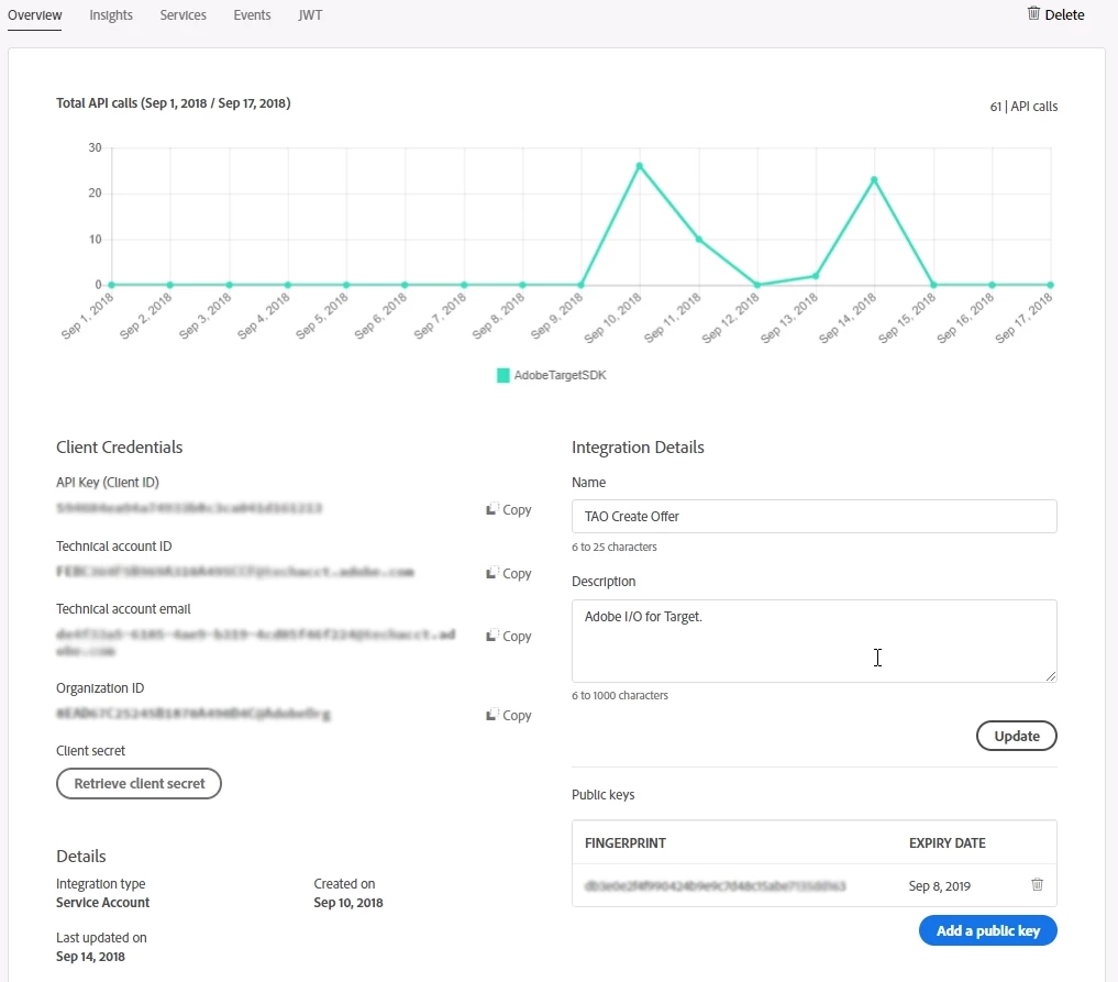 • We have done the integration with ACS using Adobe I/O and have got the API Key (Client ID), Technical account ID, Technical account email, Organization ID, Client secret.