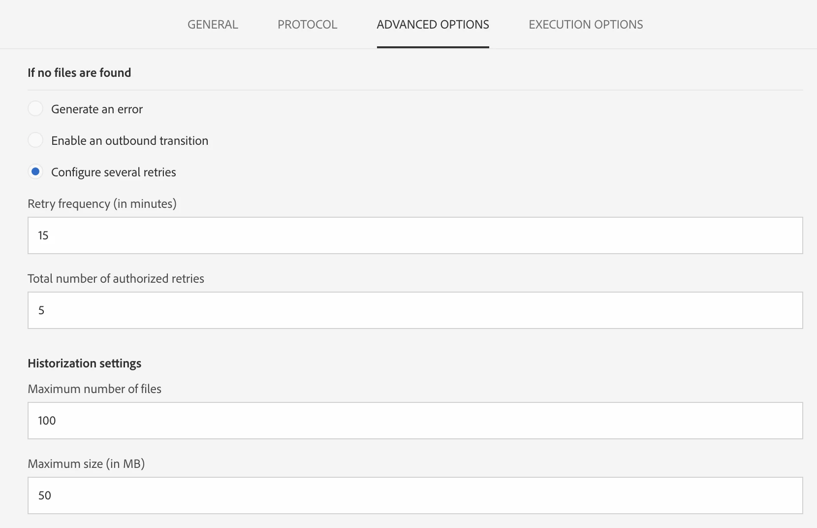 To achieve this, i have configured "configure several retries"option. But if file doesn't exist, workflow is finished at first try itself and it is not retried for 5 times with 15 mins interval. Kindly let me know how we can achieve this.