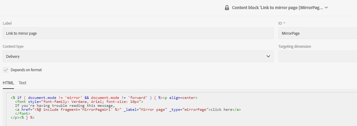 This was done by adding the code - <% if ( document.mode != 'mirror' && document.mode != 'forward' ) { %> <a href="<%@ include view='MirrorPageUrl' %>" _label="Mirror Page" _type="mirrorPage" alias="Read Online" target="_blank" style="color:#666666;">click here</a> <% } %>