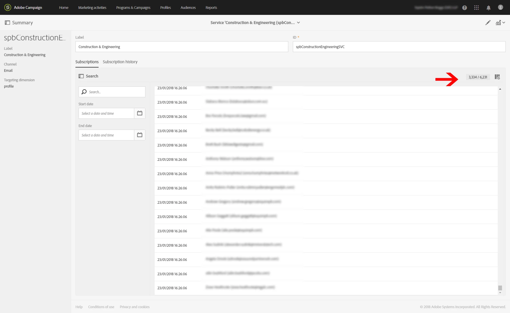I was under the impression I could go into a service, and the overall number stated above the records was the total number of records subscribed to that service. Not so. I noticed when I ran a query to export these records the result was around half that number.