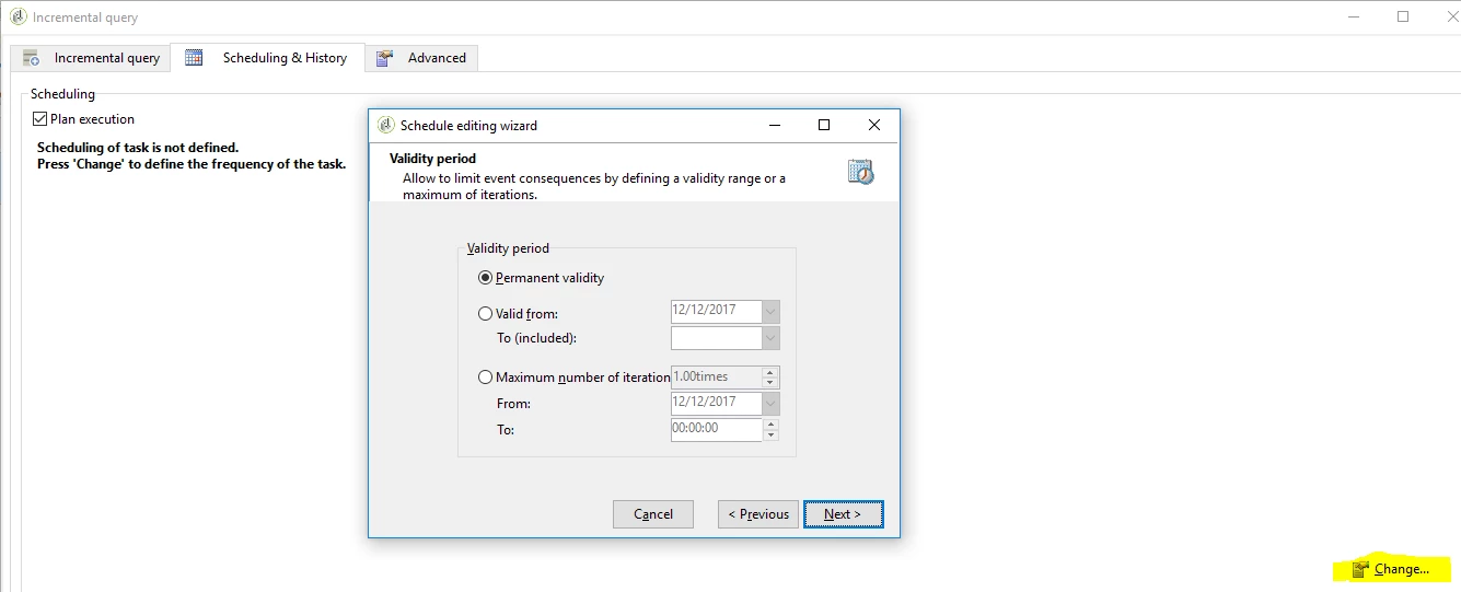 Please find the screenshot below. Go to Scheduling & History tab and click Change (highlighted in yellow) and select the validity period in one of the option windows as shown below.