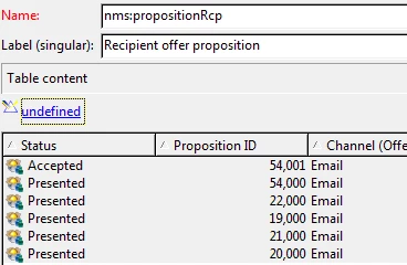 For seeing the data I’ve used a query element on “Recipient offer propositions”. “Recipient offer propositions” is also declared on your Offers - live à Environment -> Administration -> Offer Space -> Environment.