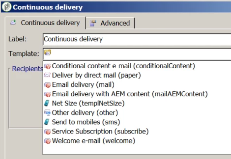 The Continuous Delivery activity, and the other delivery activities on the Actions tab, are intended to work with all channels. You select the channel based on the Template that you choose for the delivery: