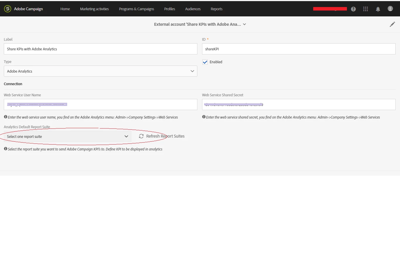 While trying to configure the external accounts for Share KPI with Adobe Analytics, I cannot see any analytics report suites in the drop down. Infact, it is read only.
