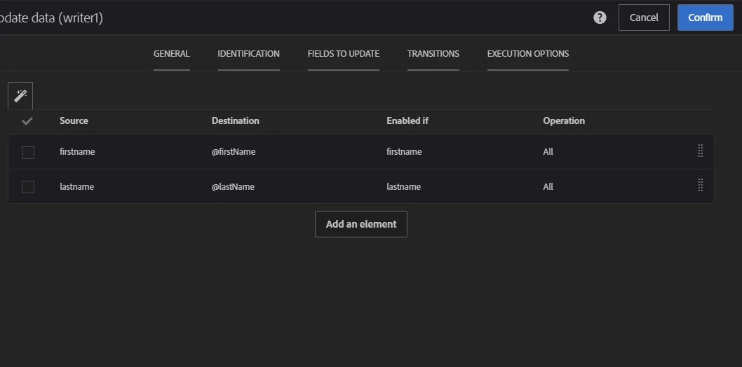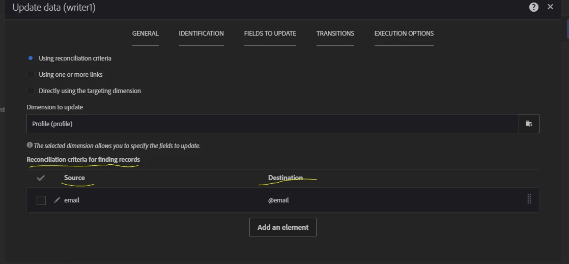 What are Reconciliatiion for finding records-->Add element--> source and destination and Feilds to update --->Add element--> source and destination,, In update Data?
