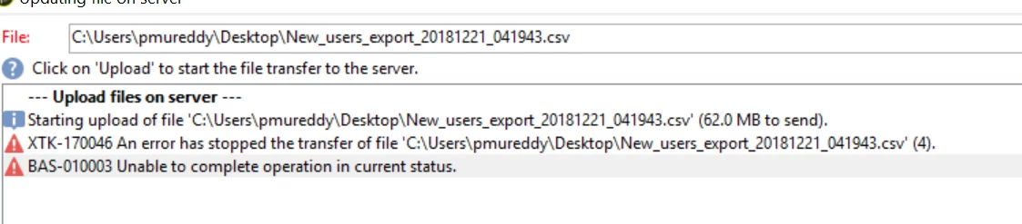 As part of POC to import recipients using workflow, In data loading activity , we chose 'Upload a file from local machine' and we tried to upload file of size '62MB', when we try to upload the file the following error is shown.