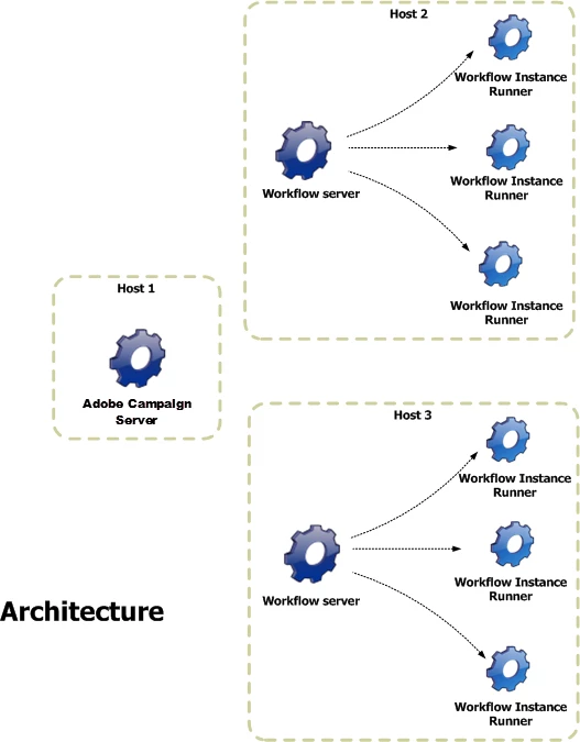 You can configure several workflow servers (wfserver) and distribute them on two or more machines. If you choose this type of architecture, configure the connection mode of the load balancers according to the Adobe Campaign access.