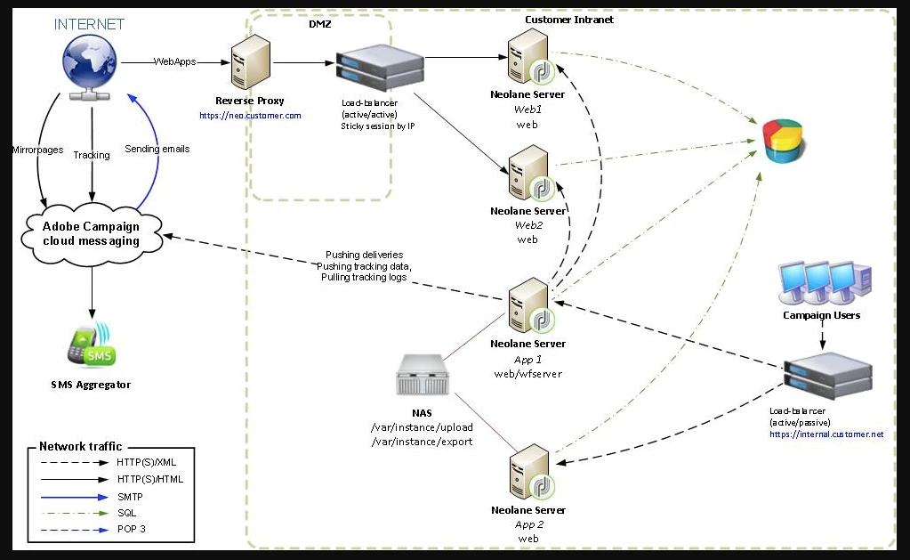 This process exposes the full range of Adobe Campaign functionality via Web Services APIs (SOAP - HTTP + XML). Furthermore, it can dynamically generate the Web pages used for HTML-based access (reports, Web forms, etc). To achieve this, this process includes an Apache Tomcat JSP server. This is the process to which the console connects.