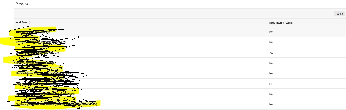example: I have a result like the above image which has no workflows with keep interim results as YES, now someone create a wkf within the UI and enables the keep results within it, my plan is to run the wkf once a day and query the wks and notify me if there is a workflow found with keep interim results enabled.