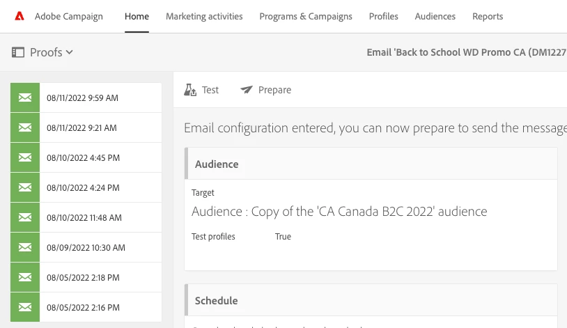 I am using Adobe Campaign Standard. I sent proofs to my test profiles & didnt receive them. The system shows sent & doesnt show issues with delivery. I sent the proofs 8 times over a period of time. I only received proof 3 & 4 out of all of them. System shows sent & green for all. See attached. Anyone have guidance on how to proceed or where to look to further trouble shoot the issue?