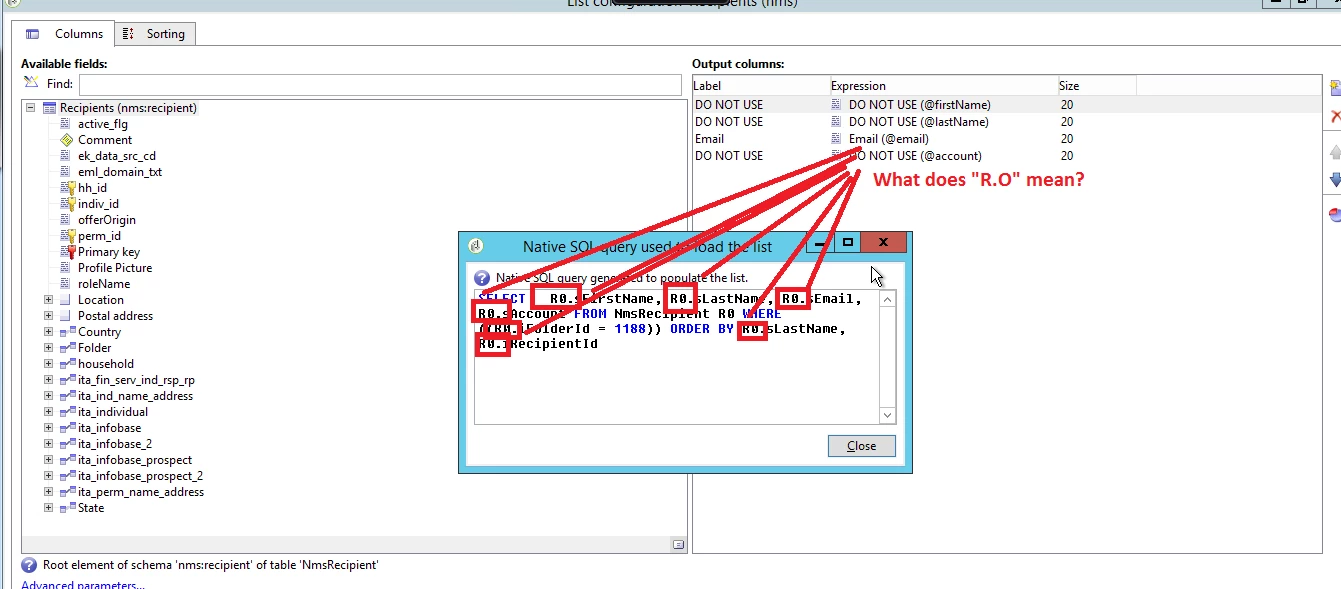 As mentioned above "R0" is the alias which is generated automatically. As query is done here for Recipient table(NmsRecipient R0) so it "R0". if you query from Delivery table (NmsDelivery D0) it is "D0" and for broad log it is (NmsBroadLogRcp) "B0".