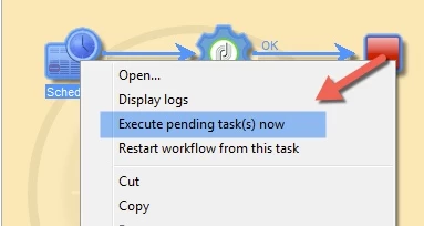 I'm not sure why you are experiencing issues with the tracking logs not triggering. If you don't want to change the schedule, you can also manually trigger the scheduler by right-clicking on the scheduler activity and selecting "Execute pending task(s) now" (see screenshot). This will execute the workflow immediately.
