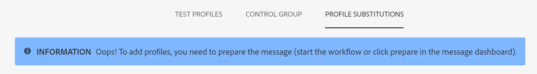 "Oops! To add profiles, you need to prepare the message (start the workflow or click prepare in the message dashboard)."