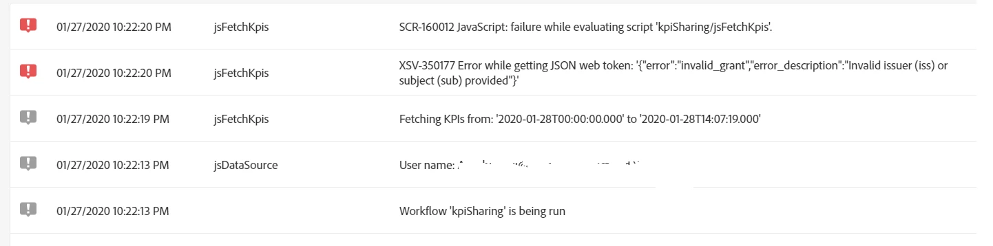 01/27/2020 10:22:20 PM | jsFetchKpis | XSV-350177 Error while getting JSON web token: '{"error":"invalid_grant","error_description":"Invalid issuer (iss) or subject (sub) provided"}' |