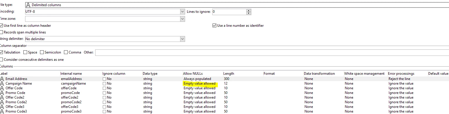 I'm trying to load data from a file to profiles with extended attributes. When I try to send an empty value in a text column i'm getting Unauthorized empty column error.