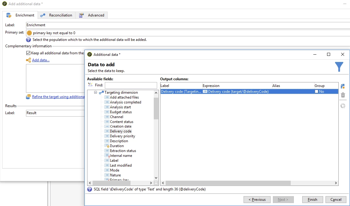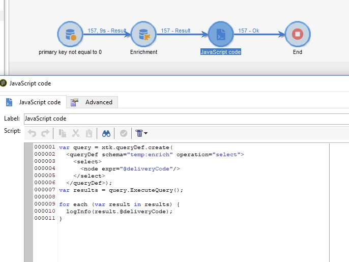 I'm able to generate the query to obtain those deliveries, and I added an enrichment with the delivery code. I would now like to create javascript variables using the values in the "Delivery code" column.