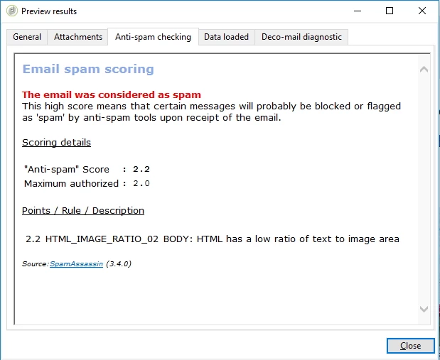 PS: the "source" link redirects to Apache SpamAssassin: Welcome. This leads to Rules/HTML_IMAGE_RATIO_02 - Spamassassin Wiki but it doesn't give much info. Also, SpamAssassin score explanation and how to improve it | MailKitchen - Free Email Marketing gives a ratio of 2/3 text - 1/3 images, but what does that mean? Number, bytes.. ?