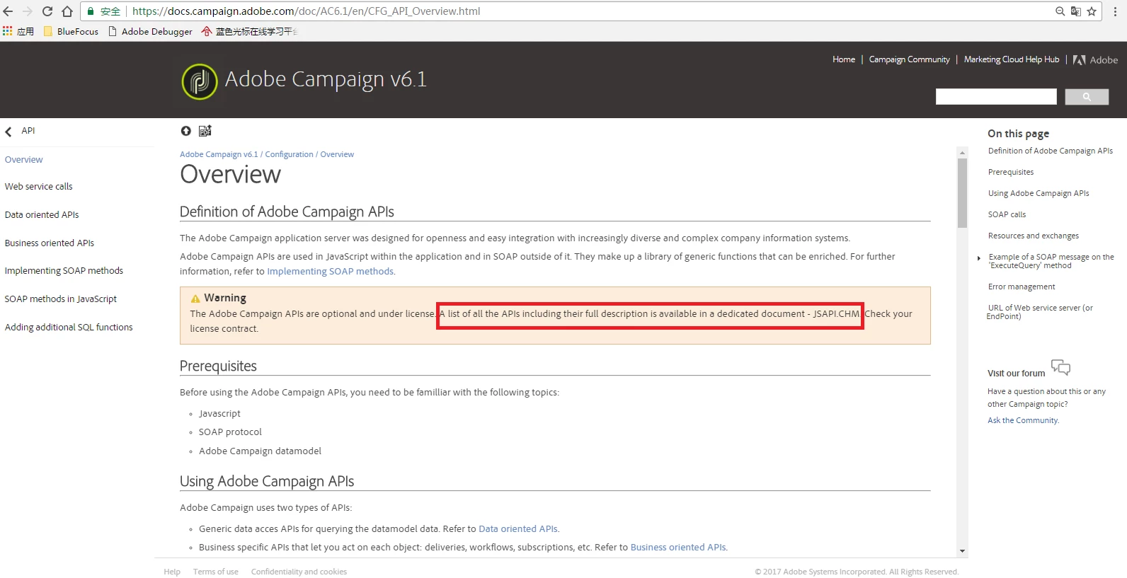 When I read about the Adobe Campaign API documentation, I found there is a javascript API document called 'JSAPI.CHM'.